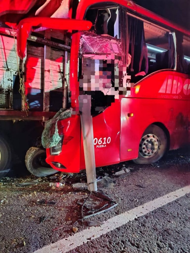 Un autobús de la línea Autobuses de Oriente (ADO), con número económico 0610, que viajaba de Puebla con destino a Mérida, colisionó por alcance contra un tractocamión. El fuerte impacto dejó al conductor del autobús, identificado de apellido Torres, prensado en la cabina, perdiendo la vida en el lugar. Junto a él también falleció un pasajero cuya identidad no ha sido revelada.