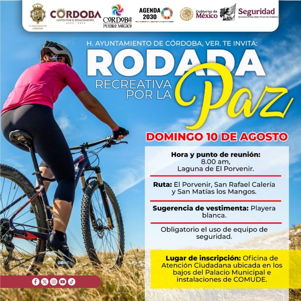 Córdoba, Ver., 04 de agosto de 2025.- El Ayuntamiento de Córdoba, te invita a participar en la “Rodada Recreativa por la Paz”, este domingo 10 de agosto a las 8:00 de la mañana, que iniciará en la localidad de “El Porvenir” y recorrerá San Rafael Calería y San Matías Los Mangos.