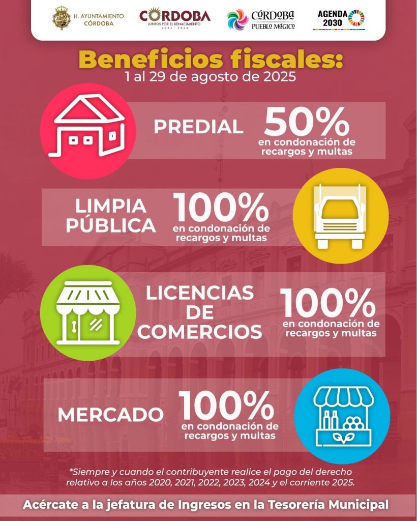 Córdoba, Ver., 20 de agosto de 2025.- El Ayuntamiento de Córdoba informa que quedan siete días hábiles para que la ciudadanía aproveche los beneficios fiscales en diversas contribuciones municipales, referente al descuento del 50% en multas y recargos por adeudos de impuesto predial, así como 100% de descuento en multas y recargos por omisión del pago de limpia pública, refrendo para la venta de bebidas alcohólicas y de mercados municipales.