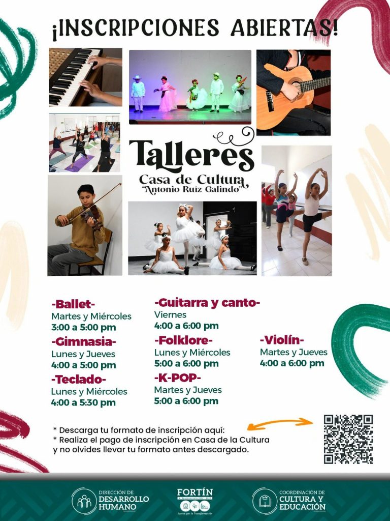 27 de agosto de 2025, Fortín, Ver. – La Dirección de Desarrollo Humano a través de la coordinación de Cultura invitan a toda la población para que se inscriban a alguno de los talleres que tendrán disponibles a partir del mes de septiembre.