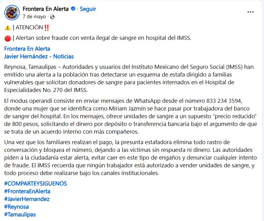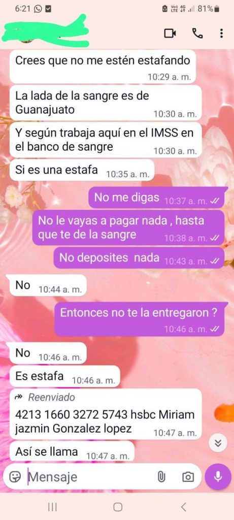 La señalada contacta a familiares de pacientes y ofrece unidades de sangre a un costo aproximado de 800 pesos, solicitando depósitos bancarios para supuestamente garantizar el suministro. Sin embargo, una vez concretada la transferencia, la estafadora bloquea los números de las víctimas, impidiendo cualquier comunicación posterior.