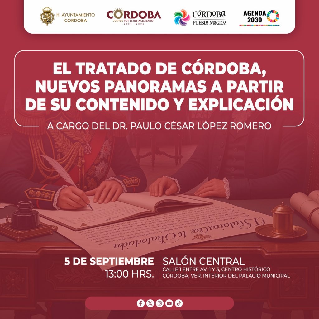 Córdoba, Ver., 04 de septiembre de 2025.- La secretaría del Ayuntamiento y la cronista Municipal, invitan al público en general, este viernes 05 de septiembre a las 13:00 horas, a la conferencia “El Tratado de Córdoba, nuevos panoramas a partir de su contenido y explicación” a cargo del Dr. en Historia Paulo César López Romero, investigador del Archivo General del Estado.