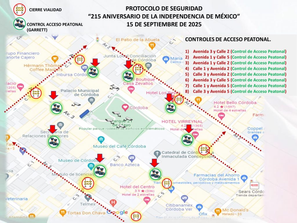 Córdoba, Ver., 10 de septiembre de 2025.- Comprometidos con brindar bienestar y que prevalezca el orden público al desarrollo de las actividades patrias que organiza el Ayuntamiento de Córdoba para las familias cordobesas, se informa del cierre de vialidades y los ocho puntos de acceso peatonales al primer cuadro de la ciudad para ingresar a la plaza cívica del parque 21 de Mayo el día 15 de septiembre en el marco de la celebración del 215 aniversario del Grito de Independencia.