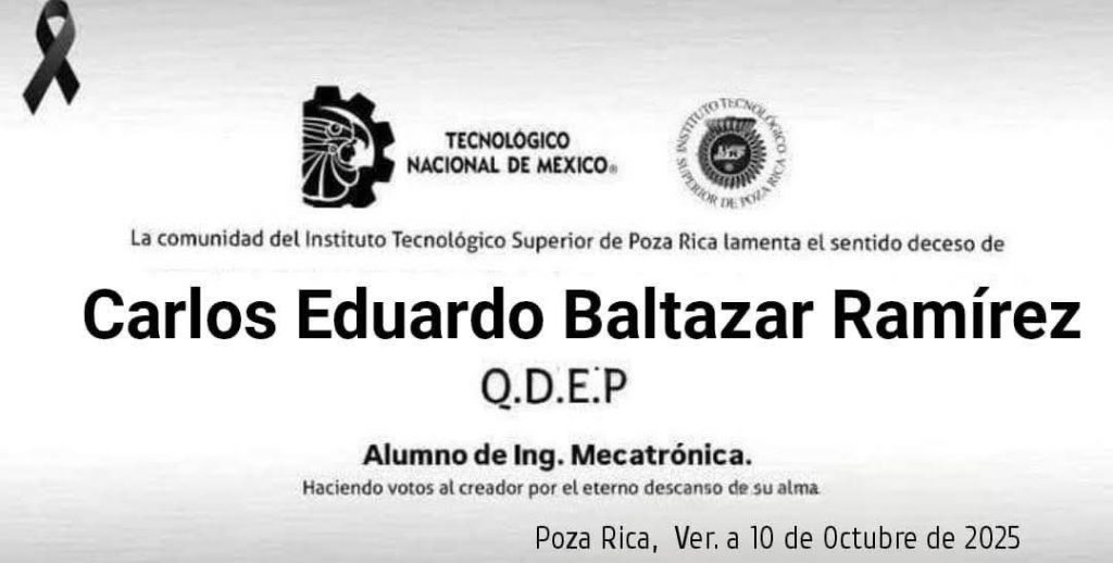 Poza Rica, Ver. — El Instituto Tecnológico Superior de Poza Rica confirmó el fallecimiento de Carlos Eduardo Baltazar Ramírez, estudiante de quinto semestre, quien perdió la vida durante las inundaciones ocasionadas por el desbordamiento del río Cazones.