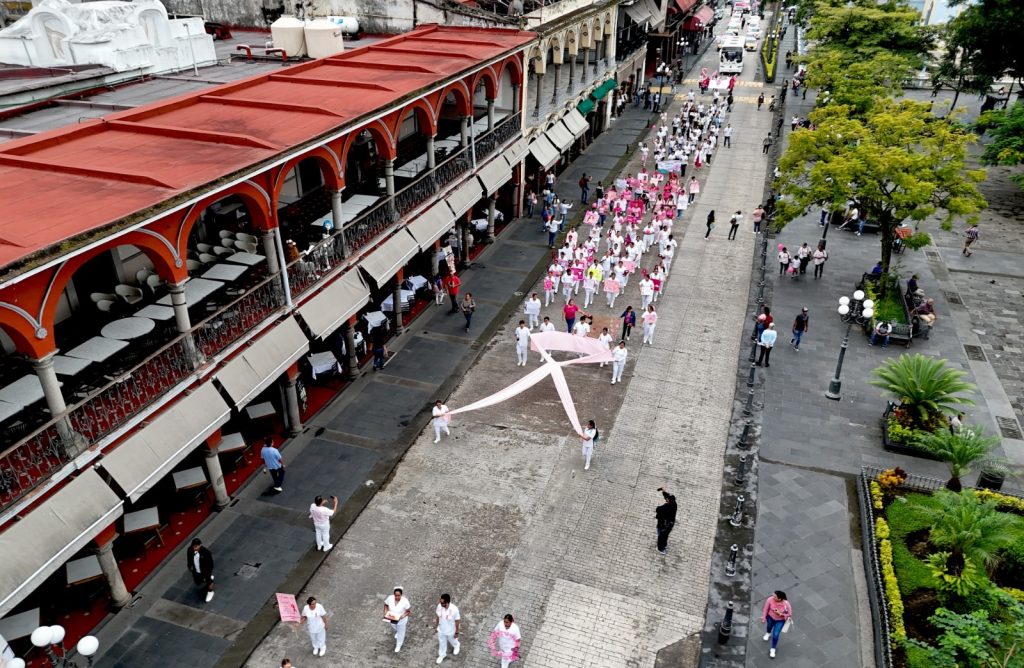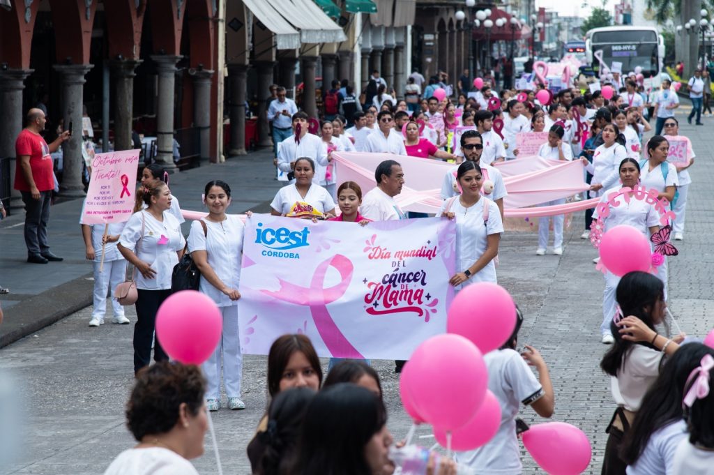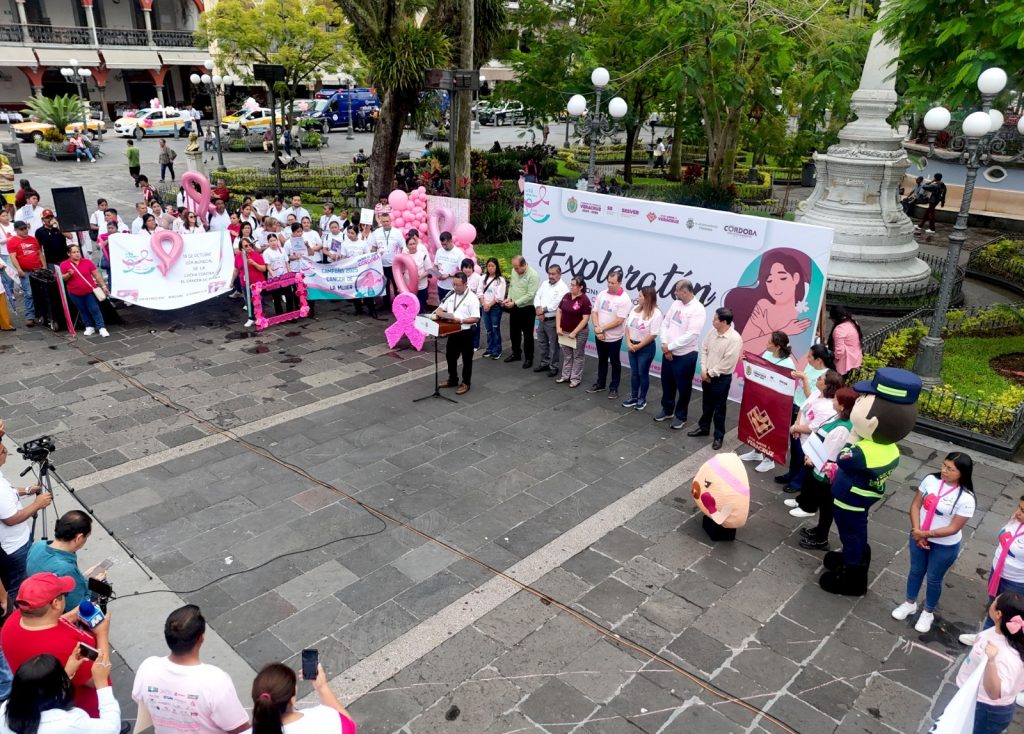 Córdoba, Ver., 20 de octubre de 2025.- En un esfuerzo en conjunto para crear conciencia y enseñar a más hombres y mujeres a realizarse la autoexploración con la finalidad de detectar y prevenir el cáncer de mama, el Ayuntamiento de Córdoba y la Jurisdicción Sanitaria número 6, realizaron el “Exploratón 2025” que incluyó una marcha y la Feria de la Salud en conmemoración del Día Mundial contra el Cáncer de Mama.
