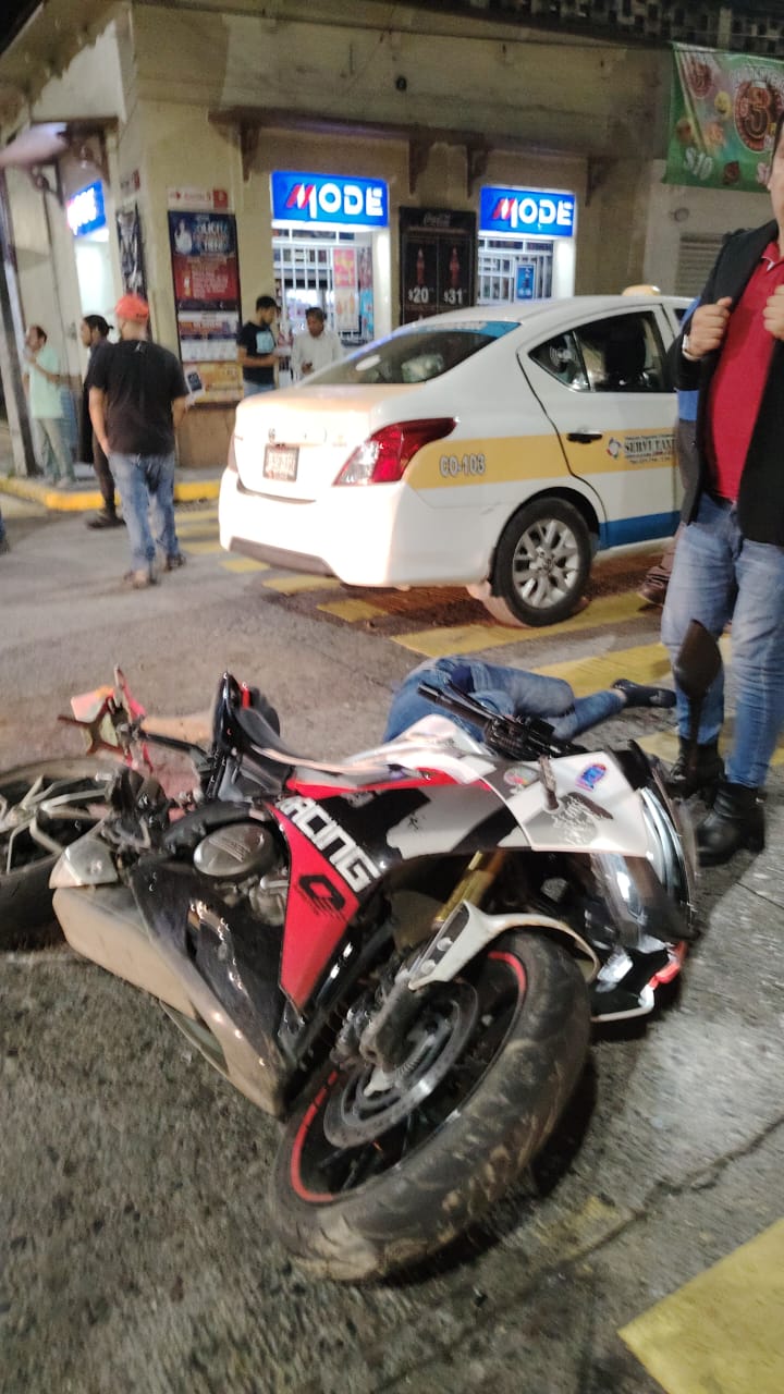 Pareja de motociclistas grave tras choque con taxi.