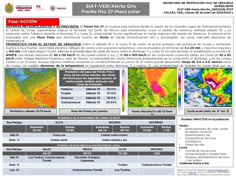 Ante el ingreso del Frente Frío número 27 al estado de Veracruz, la noche de este mismo viernes, la Unidad Municipal de Protección Civil de Fortín, llamó a la población a extremar precauciones, al referir que, provocará marcados descensos de temperaturas en la zona montañosa central.