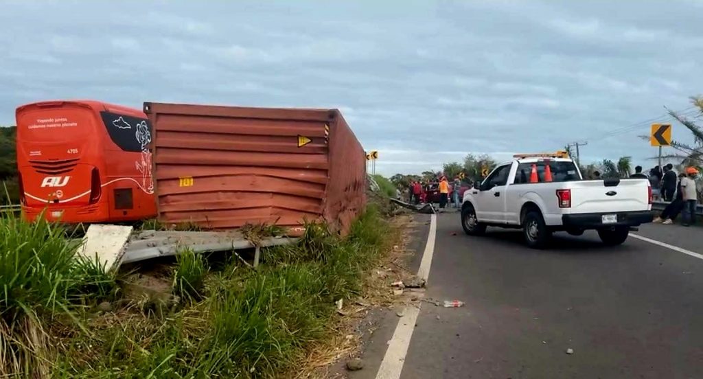 Cardel, Ver.— La tarde de este martes 13 de enero se registró un aparatoso accidente sobre el Libramiento de Cardel, donde una joven mujer resultó lesionada luego de que la caja de un tráiler se desprendiera y cayera sobre su vehículo mientras circulaba por la zona.