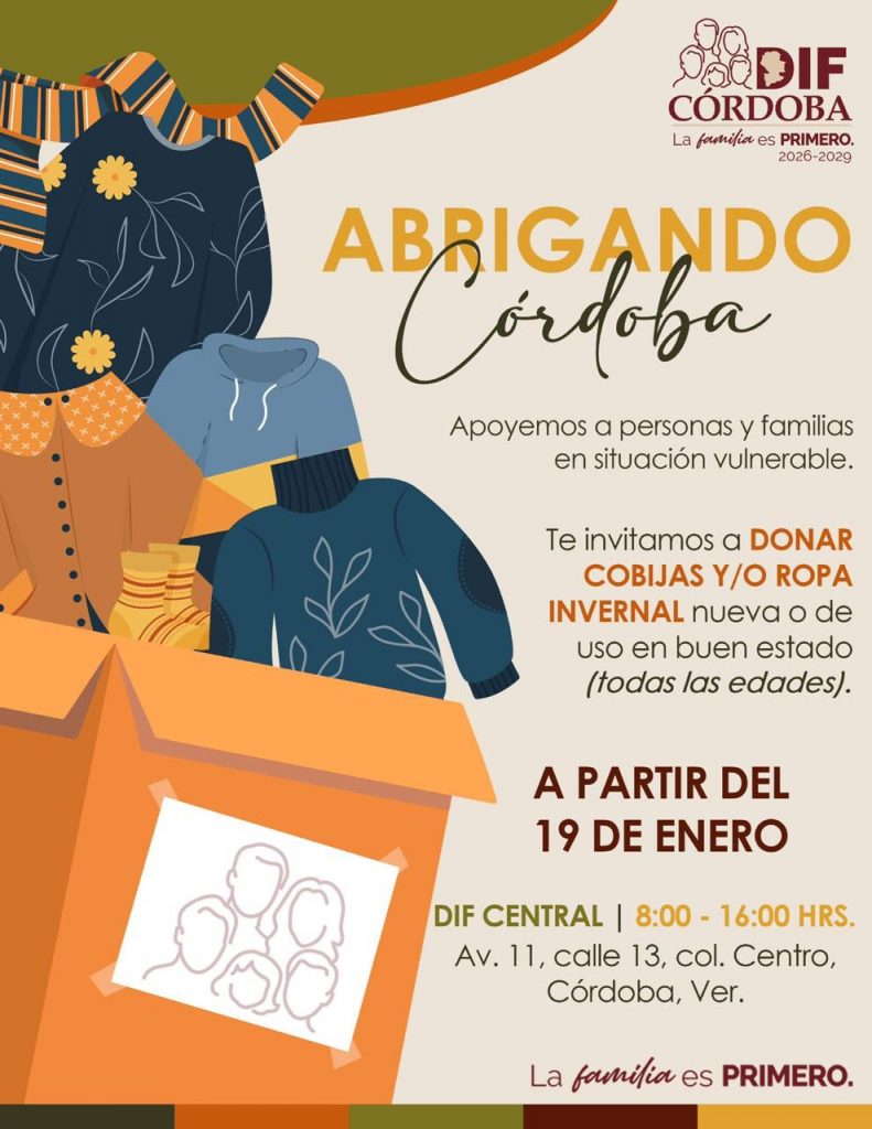 Córdoba, Ver. – Con el objetivo de recolectar ropa invernal y cobijas para apoyar a personas y familias en situación vulnerable, el Sistema Municipal para el Desarrollo Integral de la Familia (SMDIF) invita a la ciudadanía a sumarse a la colecta “Abrigando Córdoba” ante las bajas temperaturas registradas en esta temporada.
