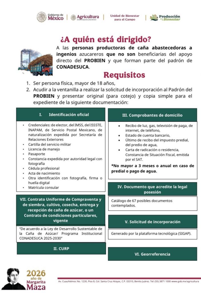 Si ya eres beneficiario del programa Producción para el Bienestar (PPB), es indispensable acudir para actualizar tus datos. Si aún no recibes el apoyo y formas parte del padrón de CONADESUCA, este es el momento para inscribirte.
