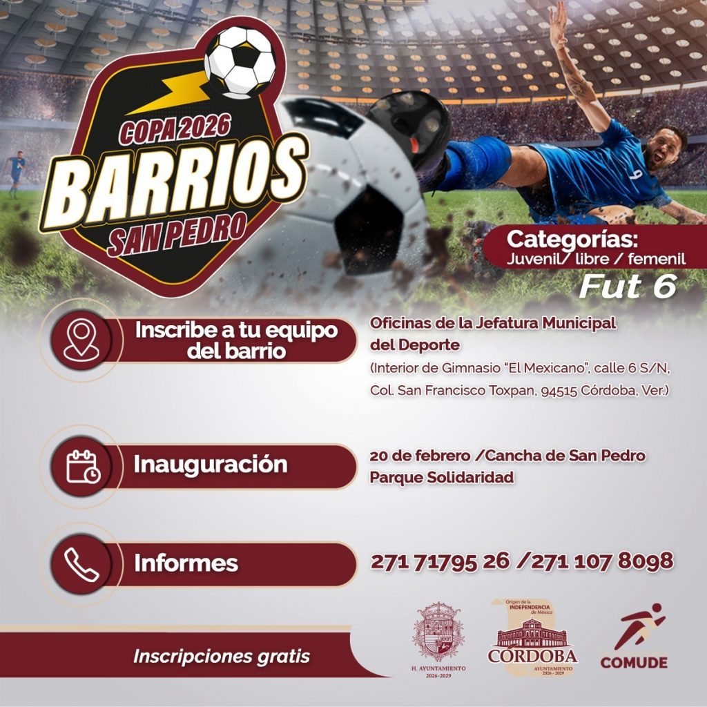 Córdoba, Ver.,12 de febrero de 2026.- La fiebre mundialista poco a poco comienza a sentirse en todo el territorio nacional, y Córdoba también se prepara para la fiesta deportiva más importante del 2026. Por ello la Jefatura de Deporte del Ayuntamiento de Córdoba tiene preparados diversos eventos futbolísticos, el primero de ellos se trata de la Copa Barrios San Pedro 2026.