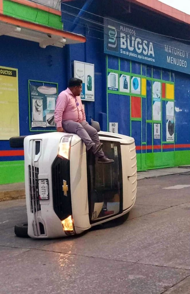 Tras la colisión, la camioneta perdió el control y volcó. A pesar de lo aparatoso del percance, no se reportaron personas lesionadas, únicamente daños materiales.