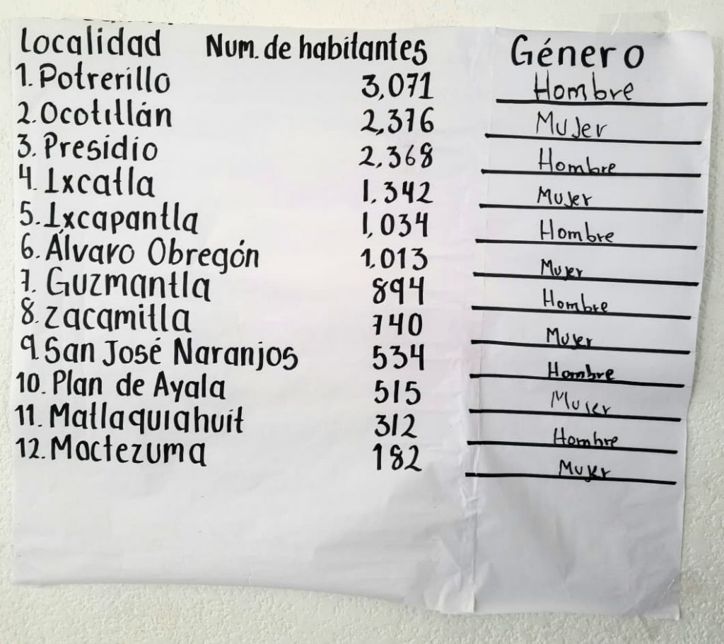 Al resultar Potrerillo con representación masculina, se procedió a definir las demás candidaturas alternando el género, por lo que Ocotitlán, Ixcatla, Álvaro Obregón, Zacamitla, Plan de Ayala y la sub agencia de Moctezuma quedaron con representación femenina, mientras que Presidio, Ixcapantla, Guzmantla, San José de los Naranjos y Matlaquiahuitl resultaron con representantes masculinos.
