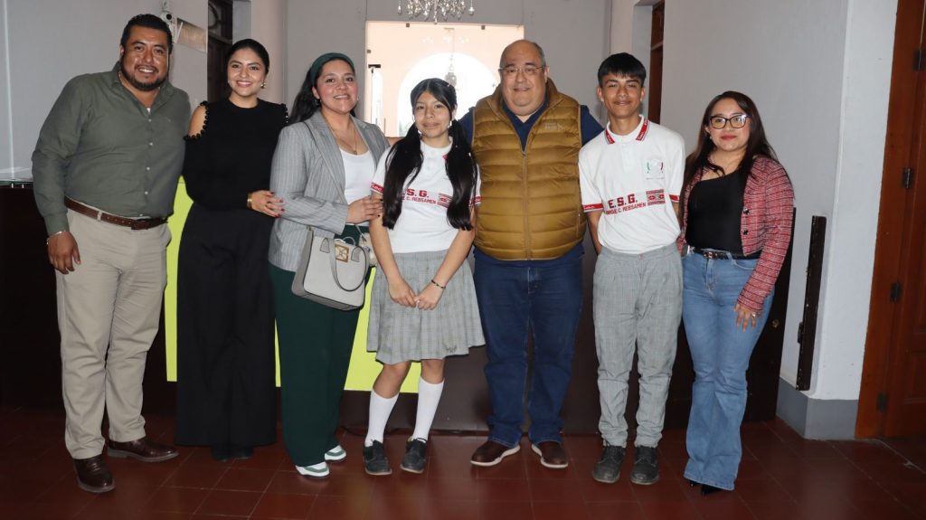 El alcalde Alfonso Efraín “Piccolo” Marín Delfín junto con la síndica única, Cecilia Rodríguez Reyes y los regidores Denia Abril Amaro Sánchez, Daniela Aguilar Huerta y Martín Montiel Victoria, regidores 3°, 4° y 5° respectivamente, recibieron a los alumnos Damara Caballero y Ernesto Rosas.