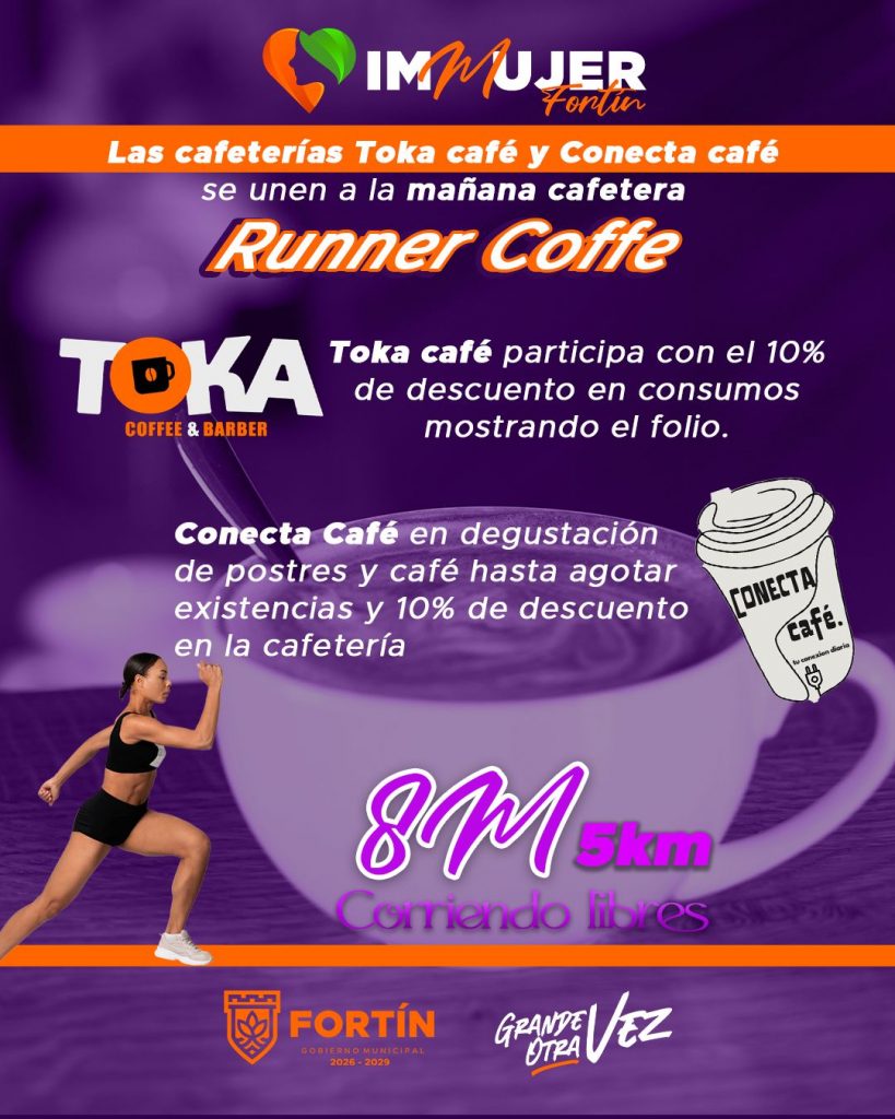 Además, las cafeterías Toka Café y Conecta Café anunciaron la “mañana cafetera” para quienes participen en la carrera y en la sesión de zumba; de esta manera las y los participantes tendrán un 10% de descuento en café americano y capuchino al mostrar su paliacate morado o su folio. También habrá degustación de postres hasta agotar existencias.
