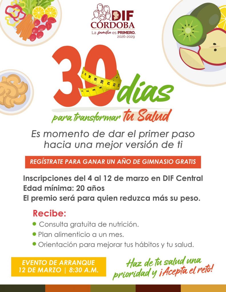 Córdoba, Ver. – Aceptar el reto puede ser el comienzo de un cambio que marque la diferencia en tu vida. El Sistema Municipal DIF invita a quienes desean mejorar sus hábitos y sentirse mejor consigo mismos a sumarse al desafío “30 días para transformar tu salud” con asesoría profesional.