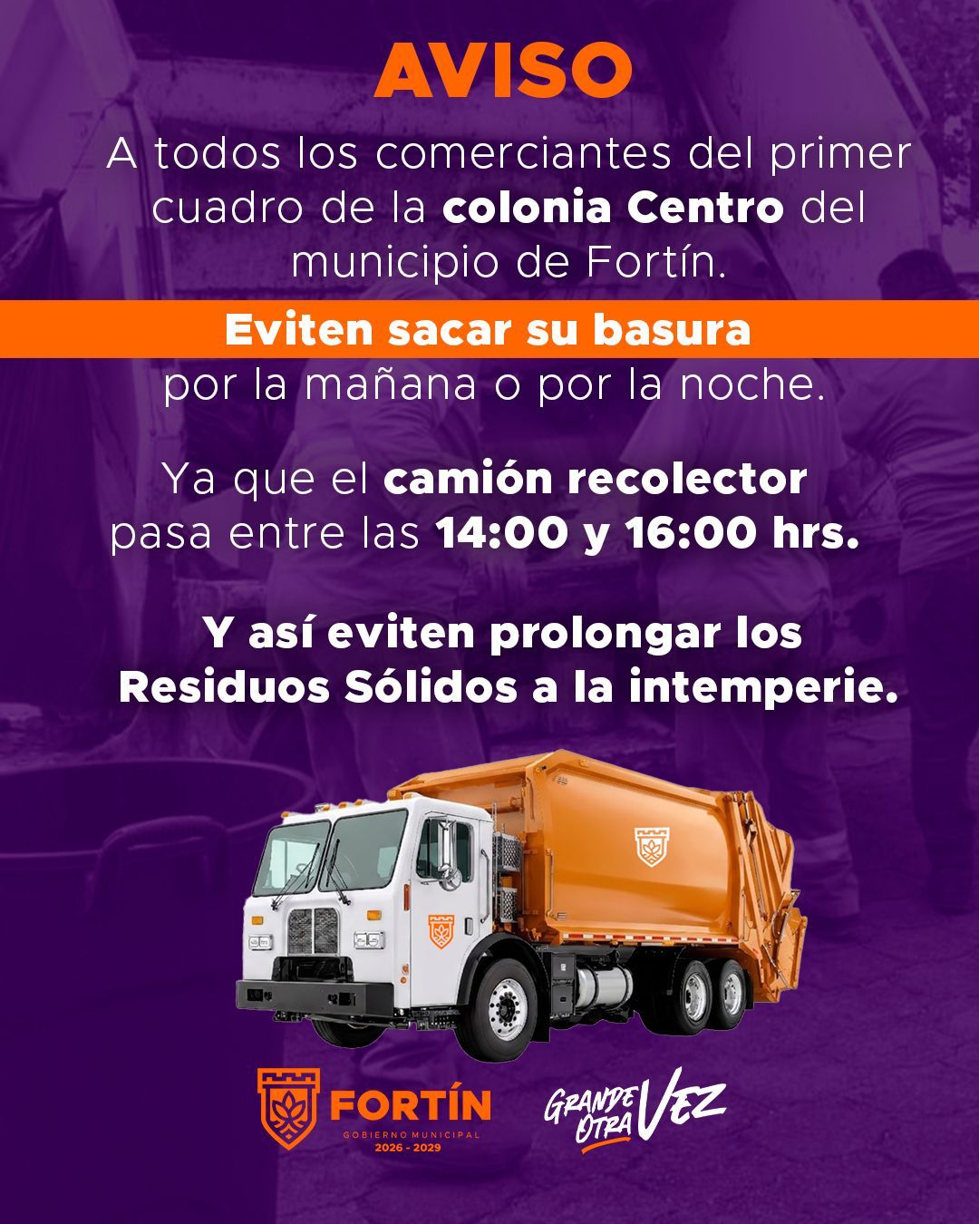 Exhorta a locatarios de Fortín a respetar horarios de basura