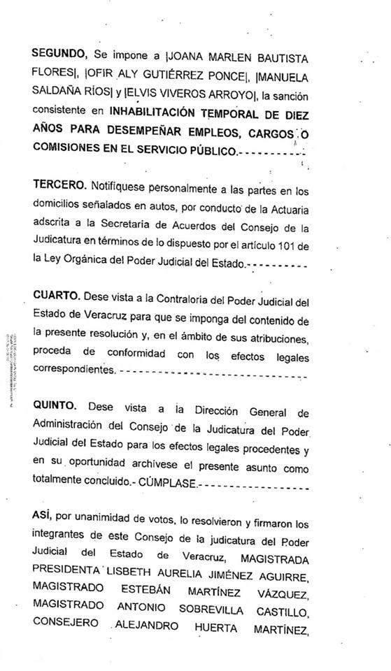 Lo anterior tras determinar que incurrió en daño patrimonial derivado de la contratación irregular de bienes y servicios durante su gestión; la sanción fue resuelta por el Consejo de la Judicatura y estará vigente del 10 de septiembre de 2024 al 9 de septiembre de 2034.