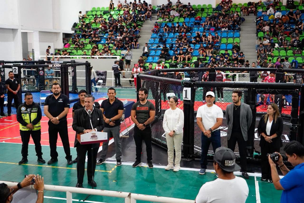 Manuel Alonso Cerezo, presidente municipal, en compañía de su esposa Carolina Mendívil de Alonso, presidenta del Sistema DIF Municipal, Dennis Araceli Lira Tosqui, coordinadora de Bienestar Social, Ricardo Rincón Espinoza, Jefe de Deporte, Guillermo Cortés González, responsable de la Infraestructura Deportiva, Jaimit Guerrero Quiñones, presidente de la Asociación Estatal de Artes Marciales Mixtas, Agustín Guzmán Arellano, vicepresidente de la Federación de Artes Marciales Mixtas del Golfo, Horacio López Villanueva, director Nacional de Oficiales y Referí UFC, y Manuel Alonso Mendívil, invitado especial, este sábado quedó inaugurado el evento en el que se conformará a la selección estatal de dicha disciplina para futuros eventos.