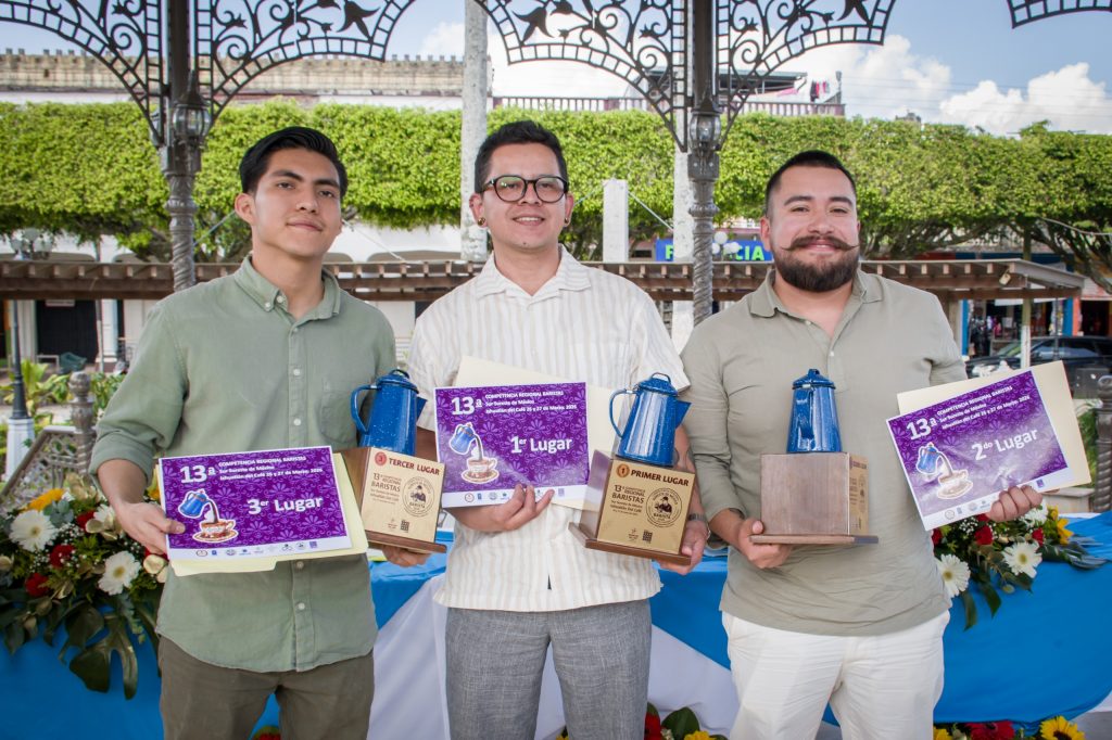 Ixhuatlán Del Café, 27 de marzo de 2026.- Luego de dos días de participación en la 13a Competencia Regional de Baristas Sur Sureste de México, finalmente se dieron a conocer a los tres primeros lugares que estarán representando a esta zona en la Expo Café en la Ciudad de México; Gabriel Erick Hernández Vázquez de Oaxaca, Guillermo Álvarez Samperio de Pachuca y Arturo Benoso Anguiano de Veracruz, son los que obtuvieron el pase directo al nacional.