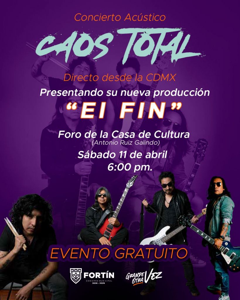 Fortín, Ver. – Para reafirmar el compromiso con la promoción cultural y el fortalecimiento de la identidad comunitaria, el Ayuntamiento de Fortín que encabeza el alcalde, Lic. Alfonso Efraín “Piccolo” Marín Delfín, invita al Concierto Acústico de la Banda de Rock “Caos Total”, quienes compartirán con el público su producción titulada “El fin” que incluye 8 temas de autoría.