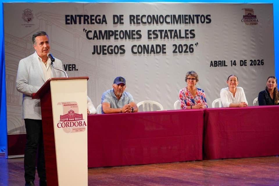 Córdoba, Ver., a 14 de abril de 2026.- El deporte ha quedado claro es uno de los pilares de la administración 2026-2029, y por ello para el Ayuntamiento de Córdoba es importantísimo reconocer el esfuerzo, disciplina y resultados de los deportistas cordobeses, por ello este martes en el Teatro Pedro Díaz autoridades locales entregaron reconocimientos a los atletas que ganaron medalla de oro en la pasada etapa Estatal de la Olimpiada Nacional Conade.