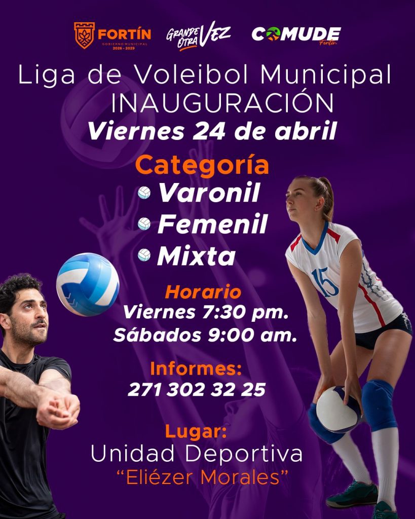 Fortín, Ver. – Con el objetivo de fortalecer la actividad deportiva y generar espacios de sana convivencia para la población, el viernes 24 de abril se pondrá en marcha la Liga de Voleibol Municipal en Fortín; con esta iniciativa, se abre la puerta a la participación de equipos en las categorías varonil, femenil y mixta, fomentando la inclusión y el desarrollo de esta disciplina en el municipio.